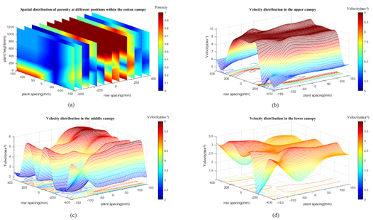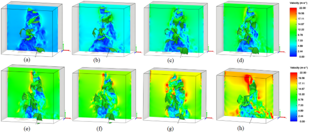 在农药喷洒过程中,决定空气辅助喷雾器在田间作物中有效喷洒的关键因素包括操作条件、作物生长期、冠层孔隙度和叶片密度特征以及环境条件。在喷洒过程中,辅助气流可以驱动农药喷雾与冠层之间的相互作用,增加雾滴在作物上的沉积。因此,数字化定量描述冠层内的气流分布可以为农药喷洒提供更有效的喷洒前预测数据,帮助农业和科学从业者更好地决策农药使用情况,选择更优化的喷雾操作参数。
